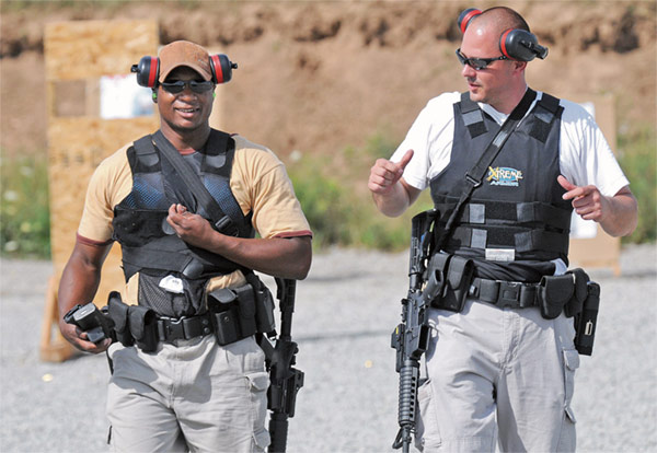 MAKING HISTORY —In this photo taken Aug. 19, newly sworn-in Green Bay police officers Solomon Ayres, left, and Tom Marquardt talk during weapons training at the multi-jurisdictional range in Oneida, Wisc.