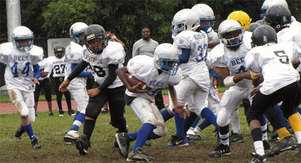 | NOWHERE TO RUN—The pocket collapses around Nigel Noel and he is sacked for a loss. |