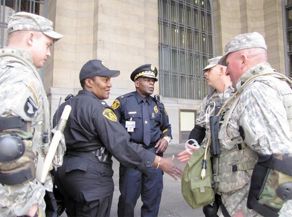 | CHIEFS—Pittsburgh Police Chief Nate Harper and assistant chief Maurita Bryant greet national guard leaders outside the county building before protesters arrived. |