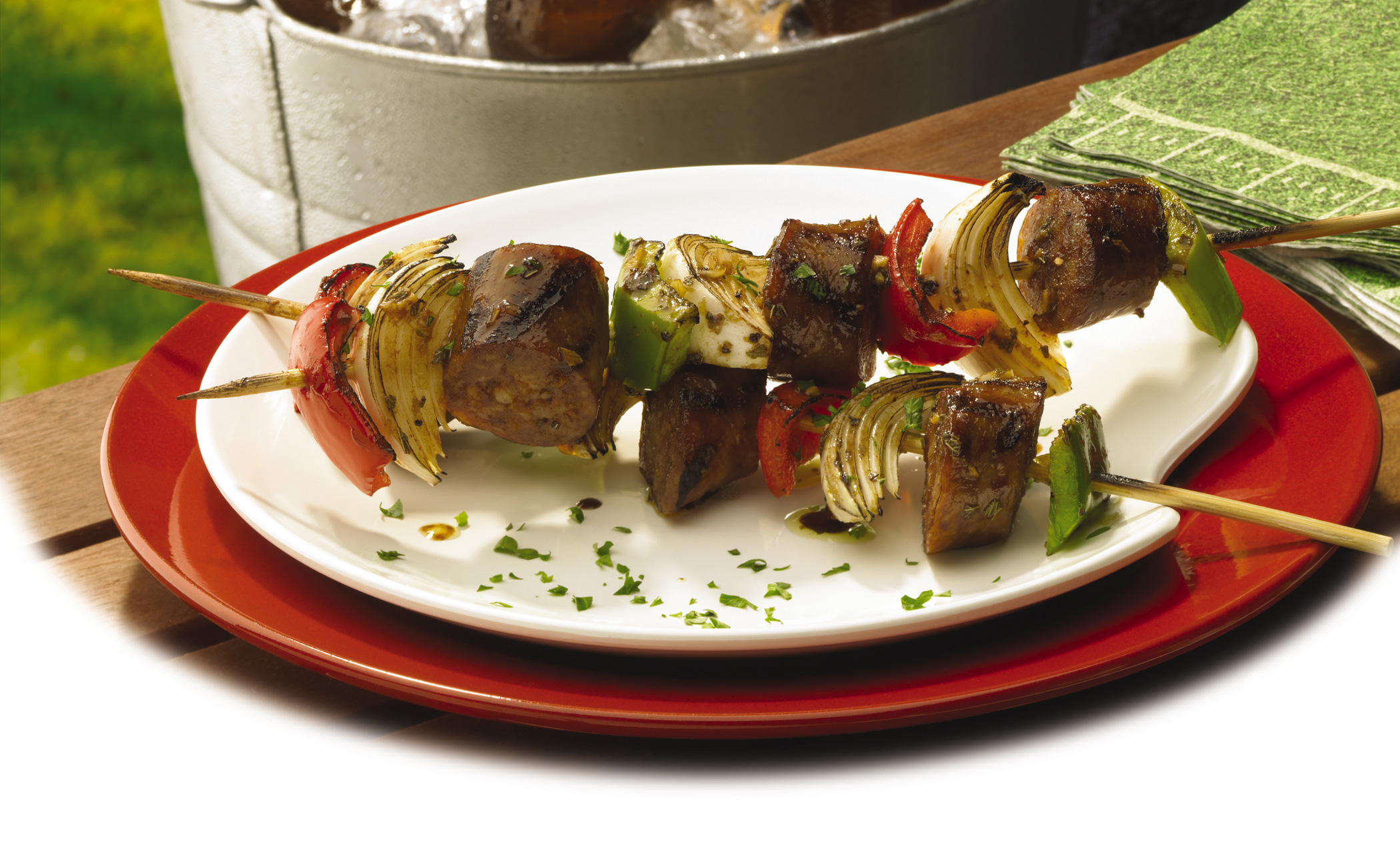 Grill the sausage links for 5 minutes per side (turning once). Remove from grill. Cut each Italian link into 6 pieces. Slice onion into wedges and peppers into chunks. Thread a piece of pepper, then sausage, then onion onto skewer. Repeat, alternating pepper colors so there are a total of 4 pieces of pepper, three sausages and three onion pieces per skewer. Repeat with remaining ingredients.