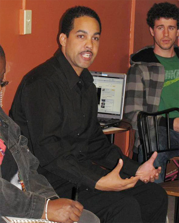 | ONE HOOD—Jasiri X facilitates an ACLU discussion at the Amani International Coffee House in the North Side. |
