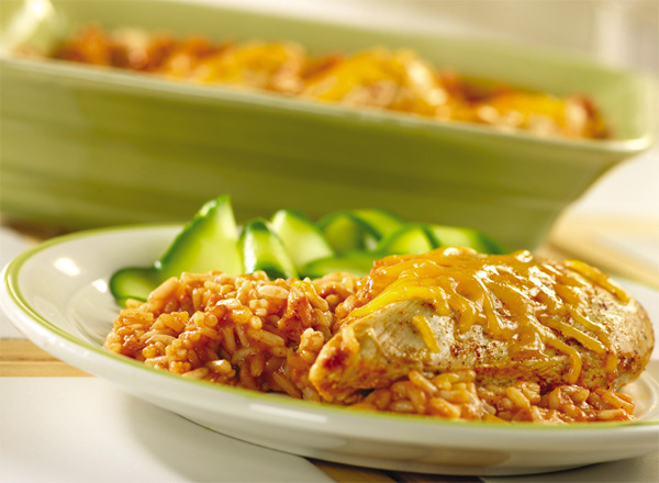 Bake at 375°F for 45 minutes or until chicken is cooked through and the rice is tender. Sprinkle with the cheese.