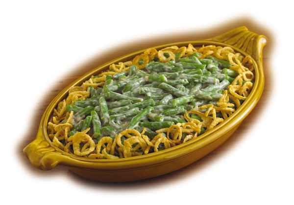 Stir the soup, milk, soy sauce, black pepper, beans and 1-1/3 cups onions in a 3-quart casserole.