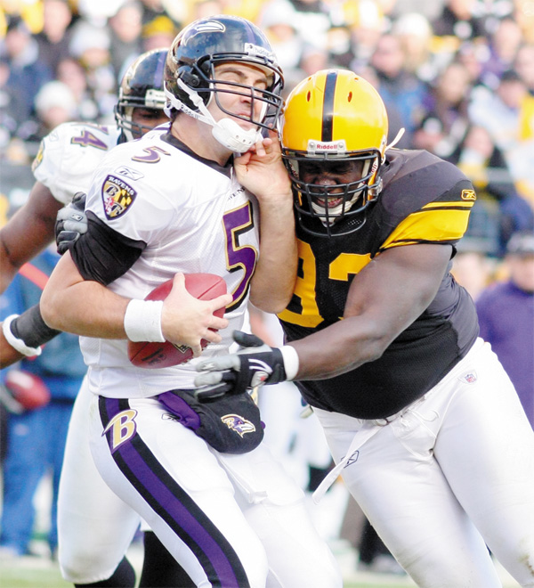 | RISING TO THE OCCASION—Steelers defensive lineman Nick Eason lays a hit on Ravens quarterback Joe Flacco Dec. 27 at Heinz Field. |
