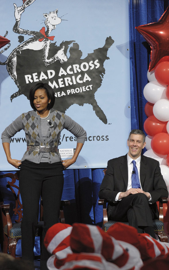 READ ACROSS AMERICA—First lady Michelle Obama, accompanied by Education Secretary Arne Duncan, takes part in the National Education Associations’ 2010 Read Across America Day, March 2, at the Library of Congress in Washington.
