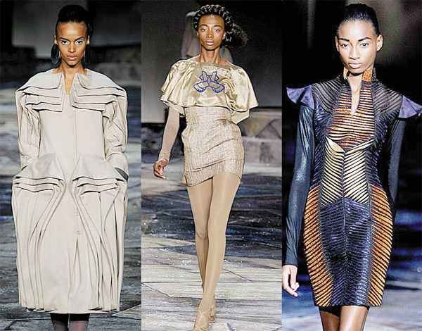 The publication chose three labels to show their fall 2010 collections: Deola Sagoe, Loin Cloth & Ashes and Black Coffee. Though distinctly different, together they exhibited a fashion-forward feel more akin to European designers than American ones. Stronger silhouettes with more dramatic volume and proportion made their garments look more like wearable works of art as the rule rather than the exception.