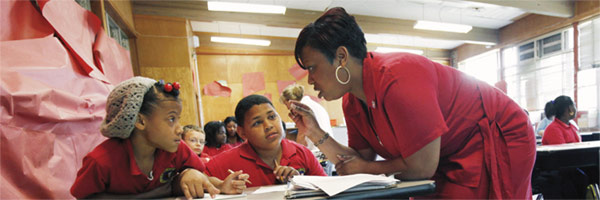 ELIGIBLE FOR MERIT BONUSES—Trenise Duvernay talks to Miracle Lee, left, and Danny Dinet, center, as she teaches fourth grade math class at the Alice M. Harte Charter School in New Orleans April 7.