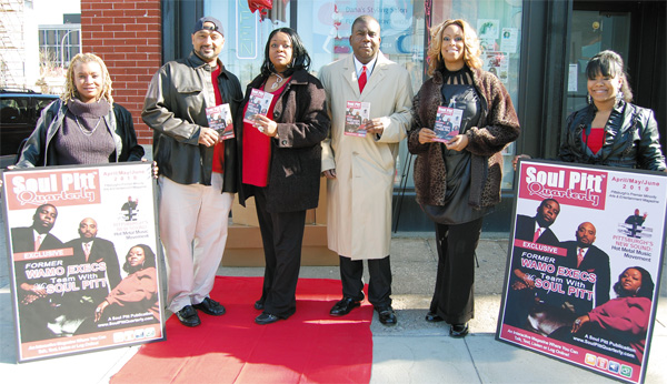 | AND HERE IT IS—Unveiling the Soul Pitt Quarterly in front of Dana’s Styling Salon in East Liberty is Mimi Gray, Ron Atkins, Donna Baxter, Craig Dawson, Dana Ramsey and Missy Murrell. |