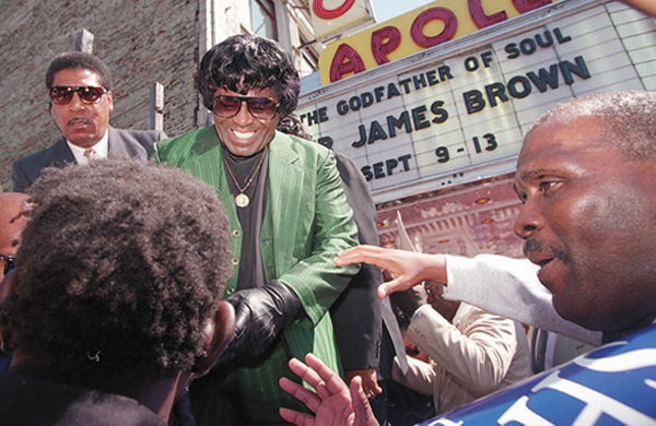 | SOUL BROTHER NO. 1—In this file photo from Sept. 8, 1994, the late singer James Brown, known also as The Godfather of Soul, greet fans outside the famed Apollo Theater in Harlem.
