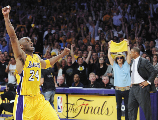 | CELEBRATION BEGINS—Los Angeles Lakers guard Kobe Bryant reacts as Boston Celtics coach Doc Rivers looks on as time runs out in Game 7 of the NBA basketball finals, June 17, in Los Angeles. |