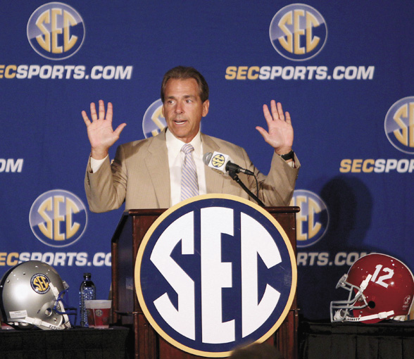 | SEC MEDIA DAY—Alabama coach Nick Saban talks to the media during the Southeastern Conference Media Days July 21, in Hoover, Ala. |