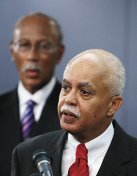 | STEPS?DOWN —Warren Evans speaks at a news conference announcing his appointment as Detroit’s new police chief as Mayor Dave Bing looks on, July 9, 2009. |