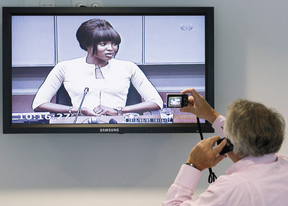 | GIVING TESTIMONY—Naomi Campbell is seen on a screen in the pressroom of the U.N.-backed Special Court for Sierra Leone in Leidschendam, Netherlands, Aug. 5. |