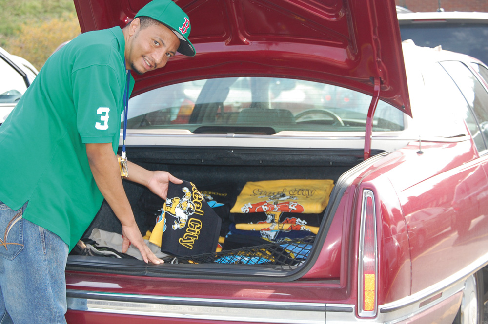 | TOWEL A-PLENTY—Owner of Steel City Stomp Towels, Eugene Berry, prepares to deliver towels to one of the stores that sells them. (Photos by Diane Daniels.)