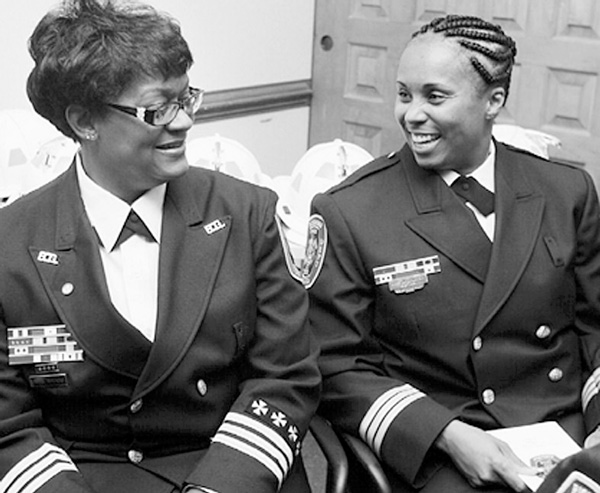 HISTORIC PROMOTION—New city Fire Department Battalion Chiefs Tina Watkins, left, and Christine Richardson chat at their historic promotion. (Photo by Jerome Reid/Richmond Free Press)