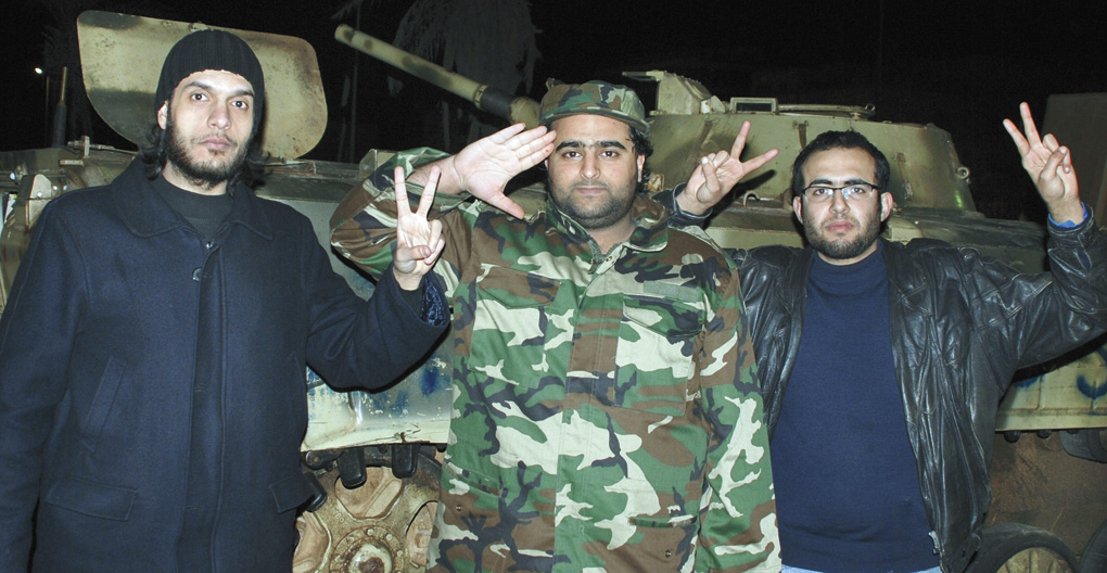 | FACES OF REVOLUTION—An army soldier and anti-regime residents pose for photos in front of a tank in the early hours of Feb. 22, in Benghazi, Libya. (AP Photo/Alaguri) |