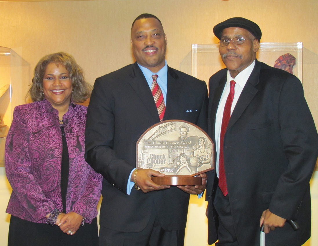| DAUGHTER AND SON—Lynell Nunn and Bill Nunn III accept their father’s award from Chuck Cooper III. (Photo by J.L. Martello) |