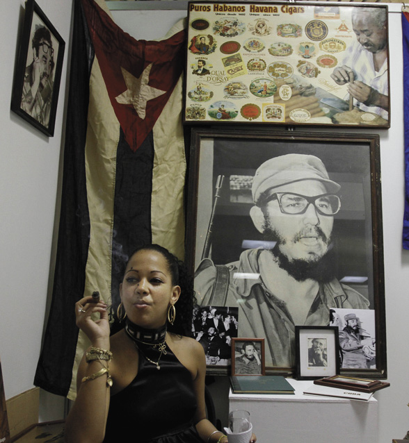| LIGHTING UP—Ariadna Gomez smokes a cigar next to an image of Cuba’s leader Fidel Castro during the 13th annual Cigar Festival in Havana, Cuba, Feb. 21. (AP Photo/Franklin Reyes) |