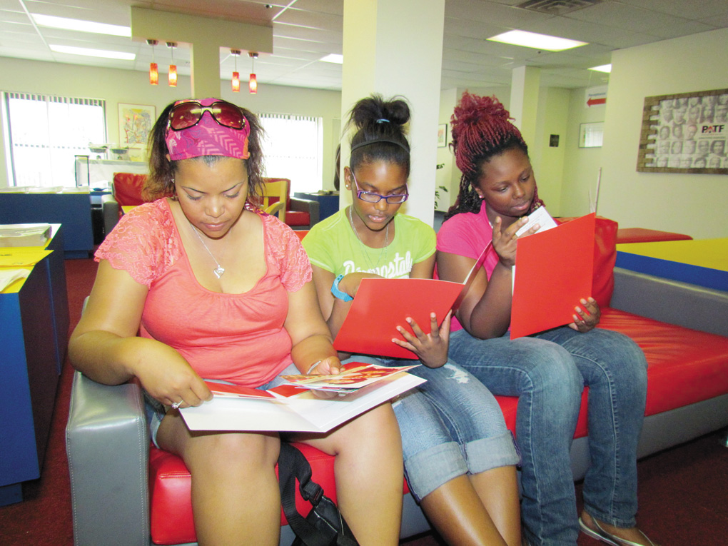 | JOINING THE FIGHT—Tamika Gethers of Garfield, with daughter Jade Gethers, 13, and niece Stevie Jamison, 13 and of Stanton heights, reading literature on the PATF and their fight against STDs. |