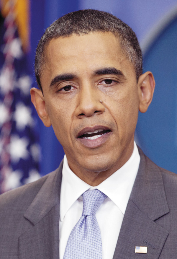 | THE BIG 5-0—President Barack Obama speaks from the White House briefing room in Washington, July 31, about a deal being reached to raise the debt limit. (AP Photo/Carolyn Kaster) |