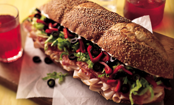 Tailgating Tip: To make for easy eating, wrap sandwich in parchment paper (like at a sandwich shop) and then slice with a serrated knife. Wrap in foil for transport.
