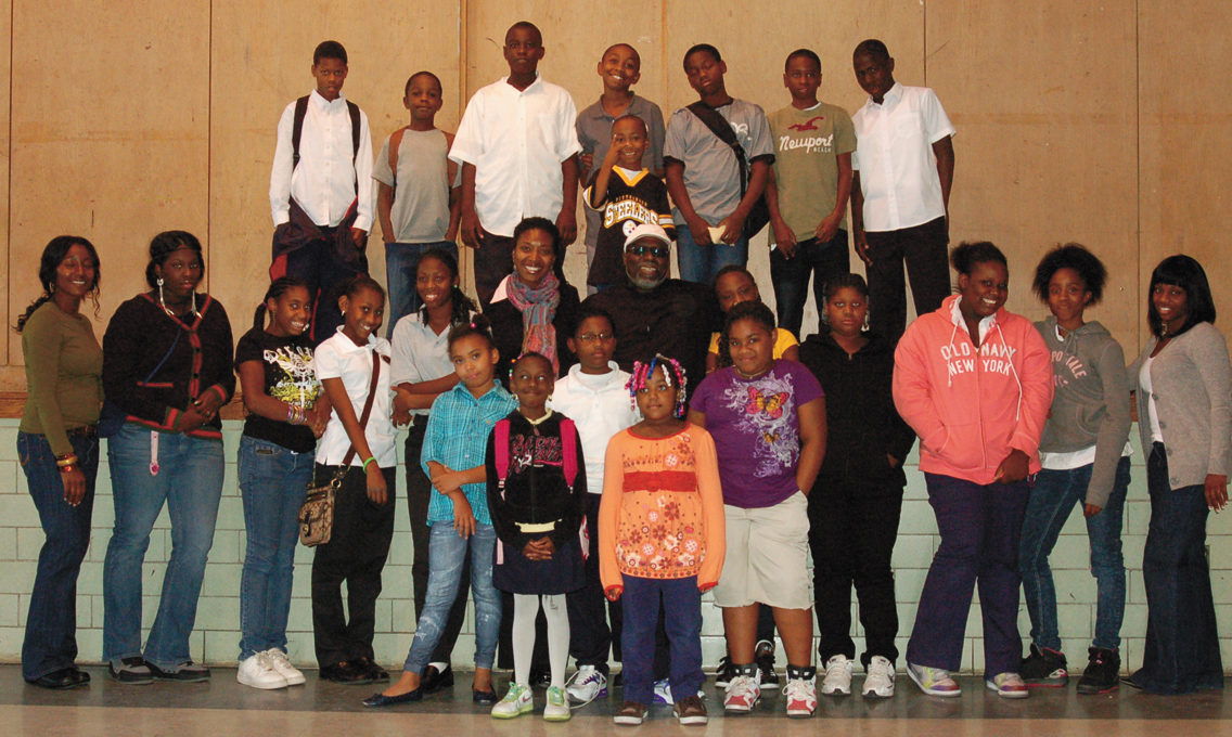 | FUTURE IN THE ARTS—Rashad Byrdsong is surrounded by East End students who will be exposed to the arts in a unique venture by CEA and AWC. (Photo by Rossano P. Stewart) |