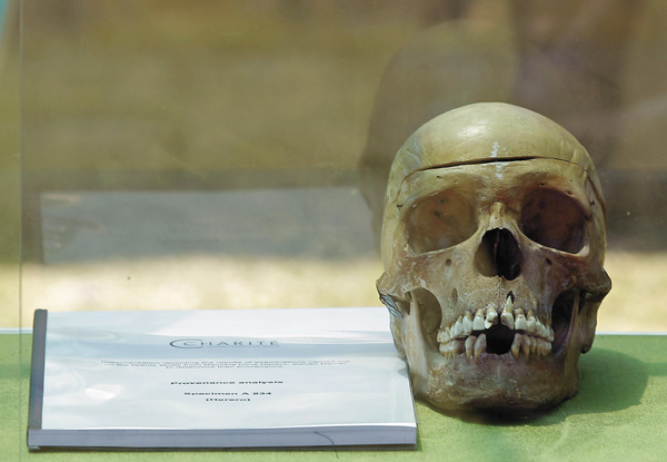 | HOLOCAUST REMINDER—A skull from Germany on display in the city of Windhoek, Namibia, Oct 4. (AP Photo/Schalk van Zuydam) |
