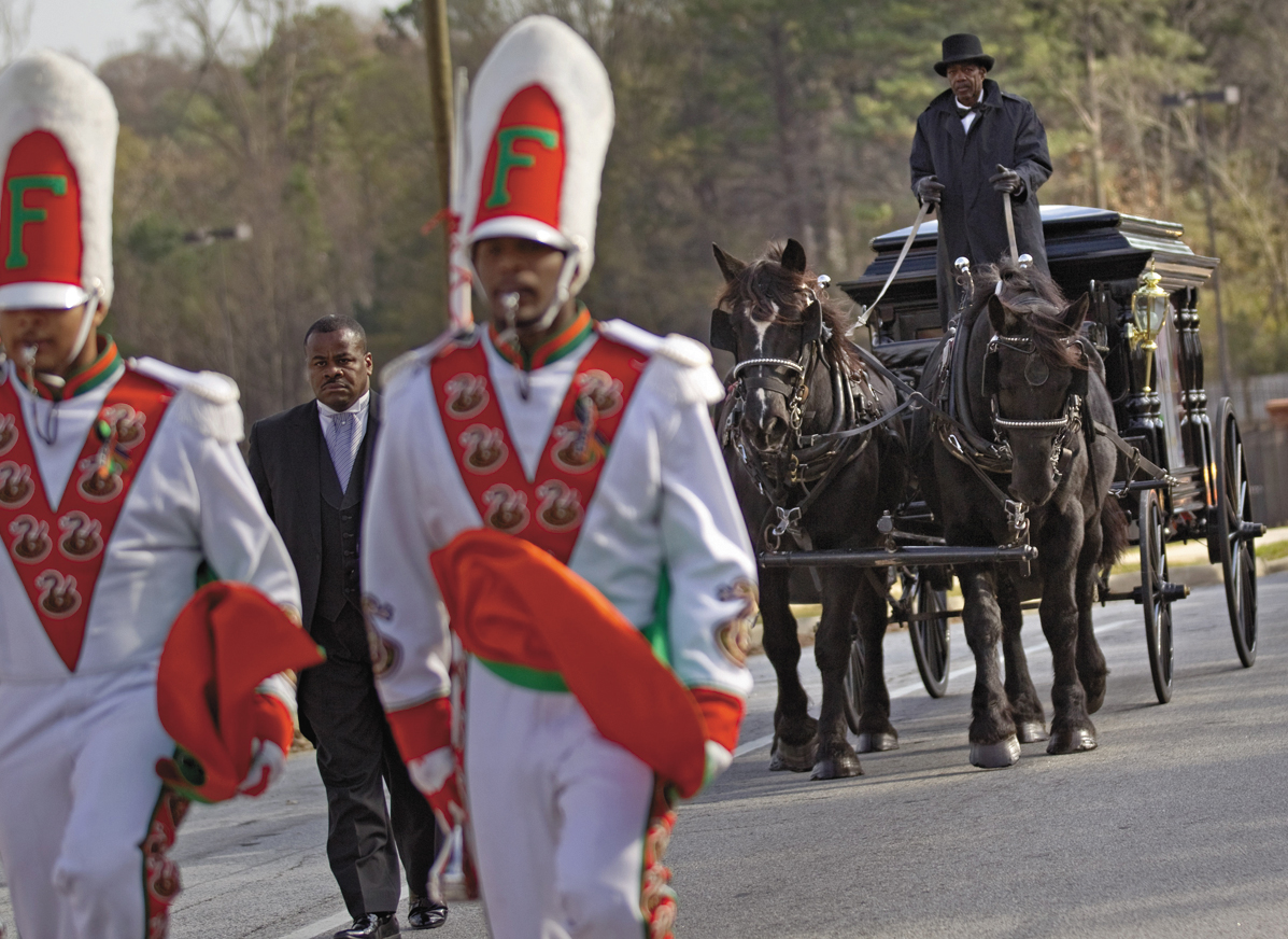 | LAID TO REST—A horse drawn carriage carrying the casket of Florida A&M University band member Robert Champion is led by his fellow band members following his funeral service Nov. 30, in Decatur, Ga. |