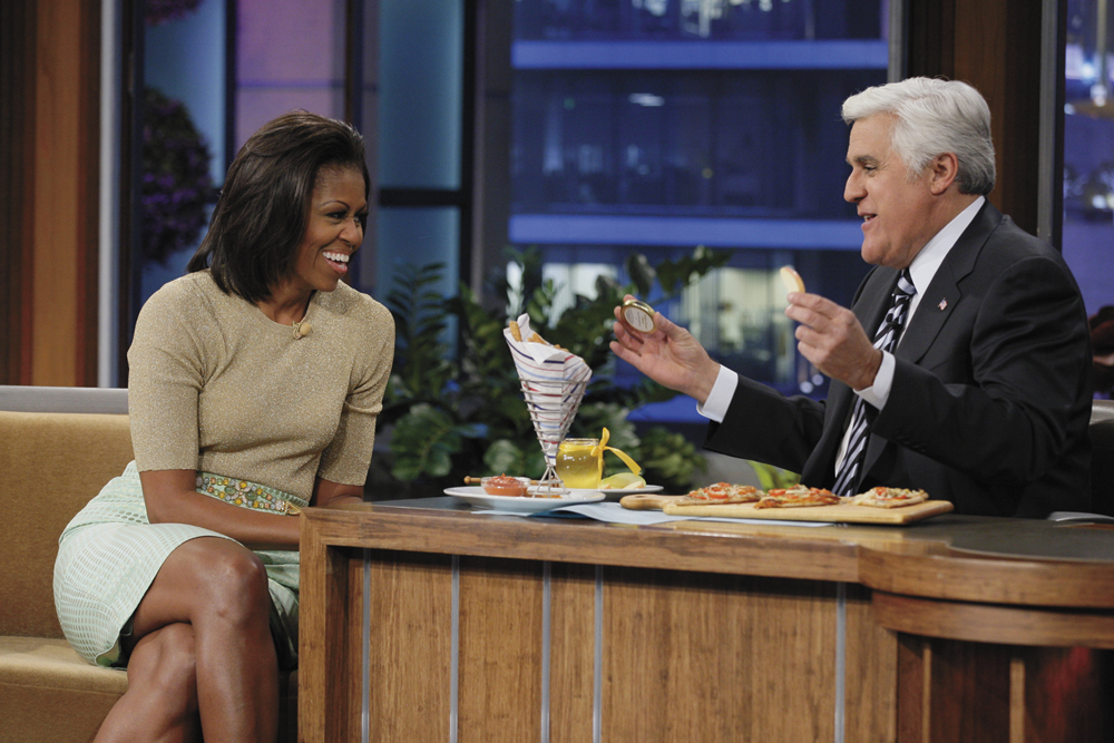 First lady Michelle Obama cajoled Jay Leno into nibbling on apples, sweet potato fries and a pizza made with eggplant, green peppers and zucchini on the “Tonight Show,” breaking his long-held aversion for all-things-healthy in his diet.