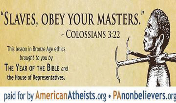 Atheist groups unveiled the billboard March 5 in protest of a law passed by Pennsylvania lawmakers deeming 2012 “The Year of the Bible.” Lawmakers believed a return to faith would help the nation through its present troubles. The sign mocks that belief, quoting the Bible text, “Slaves obey your masters” next to a large image of the shackled slave.