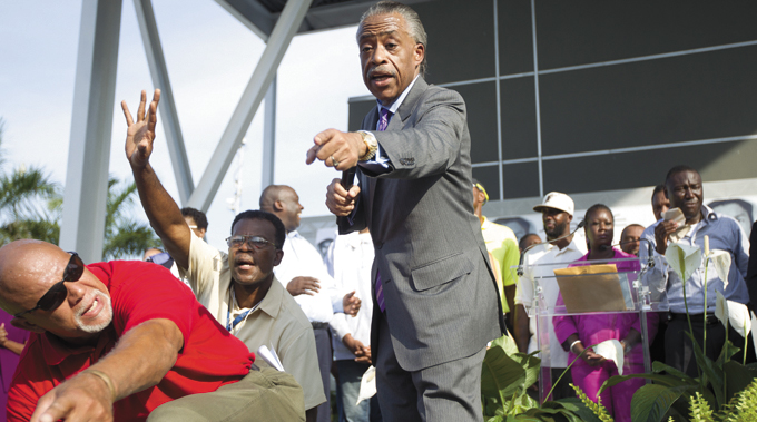 | VOICE FOR JUSTICE—Rev. Al Sharpton speaks at a rally as thousands gathered in downtown Miami, April 1, demanding justice for Trayvon Martin. (AP Photo/J Pat Carter) |