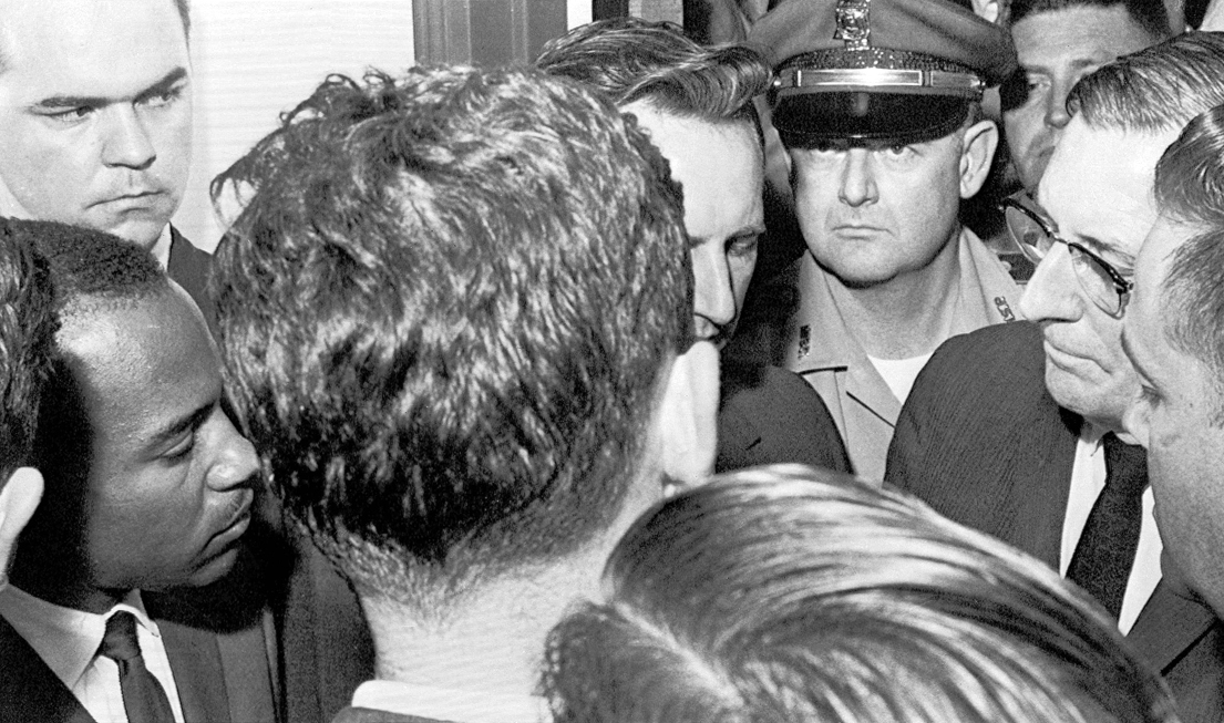 HISTORIC STANDOFF—In this Sept. 25, 1962 photograph, Mississippi Gov. Ross Barnett, wearing glasses at right, refuses to allow James H. Meredith, left, admittance to the University of Mississippi in scene outside the university trustees’ office in Jackson, Miss. (AP Photo)
