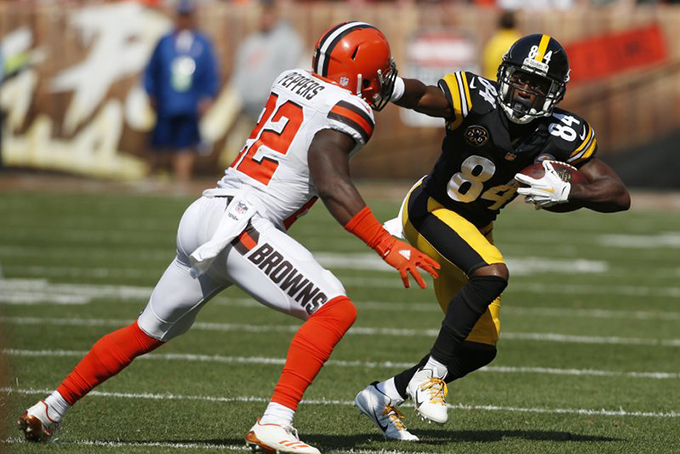 Pittsburgh Steelers wide receiver Antonio Brown (84) holds off Cleveland Browns linebacker Jabrill Peppers (22) during the second half of an NFL football game, Sunday, Sept. 10, 2017, in Cleveland. (AP Photo/Ron Schwane)