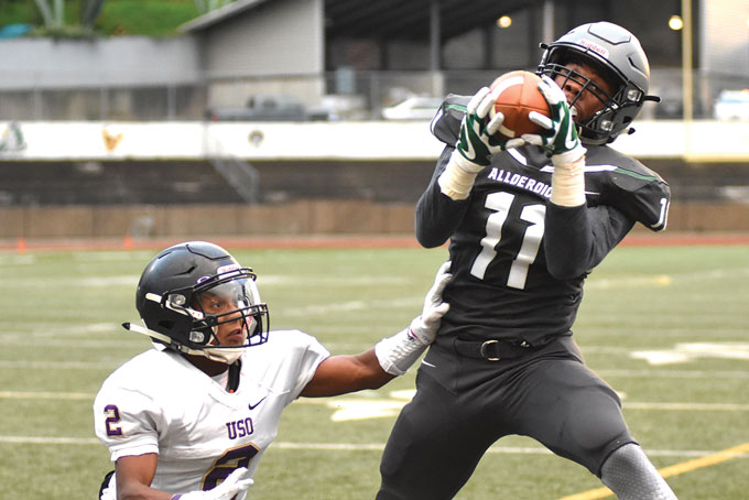 COURIER PHOTOGRAPHER WILL MCBRIDE captures Dice’s Raquan Caldwell with a nice catch over Damon Macklin of USO in a game earlier this season.