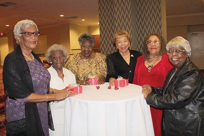 Lingaire Njie and Kaylan Moore came to the podium to make a special presentation to a group of DST “Torchbearers,” ladies who have been members of DST for more than 60 years: Janet Bell, Frances Butts, Martina Corbin, Helena Hughes, Rachel Jones, Beatrice Mahaffey, Cecile Springer, Rosalind Waller, Clarice Willoughby and Birdie Nichlos. After a celebratory toast led by Gloria Walton and remarks from Ann Haley, the ladies of DST joined hands and sang their sweetheart song. Guests enjoyed a great meal with red velvet cake for dessert and danced to the music of Lyndsey Smith and Soul Distribution.