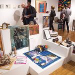 The colors and textures of the landscape of South Africa, the “Rainbow Country,” were a major inspiration for her recent work. The injustice young African American men and women face also inform the work, the release mentioned, as evidenced by pieces entitled “Black Lives Matter 2” and “Black vs. Blue Don’t Shoot.” These prints feature bold color combinations and textured surfaces and have been folded, overlapped and glued to form two-dimensional sculptures. The show also included an installation that incorporated athletic sneakers donated by the community during an open call period.