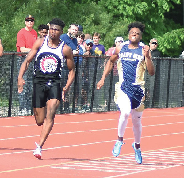 MJ DEVONSHIRE, left, of Aliquippa, edged out Michael “Dino” Tomlin of Shady Side Academy to win the Class 2A 100-meter dash.