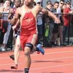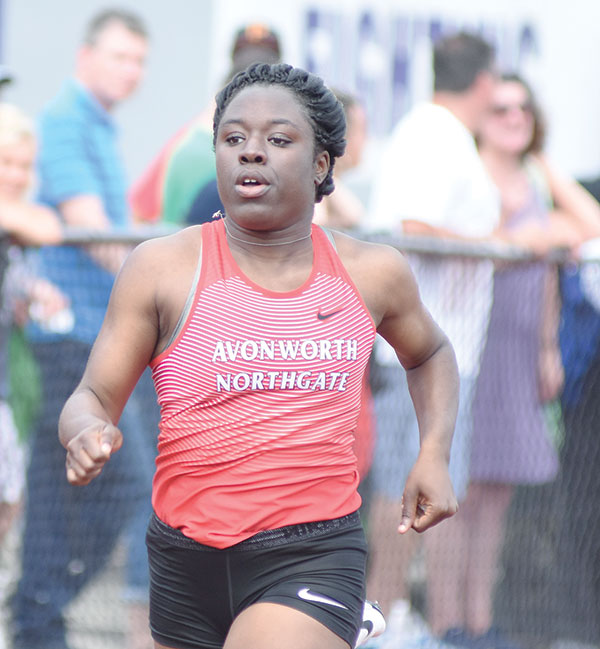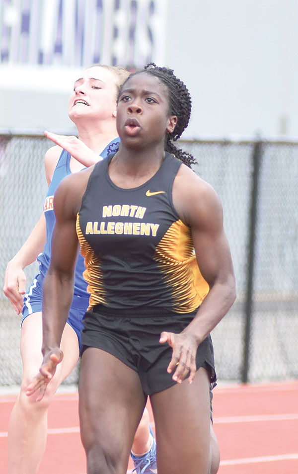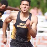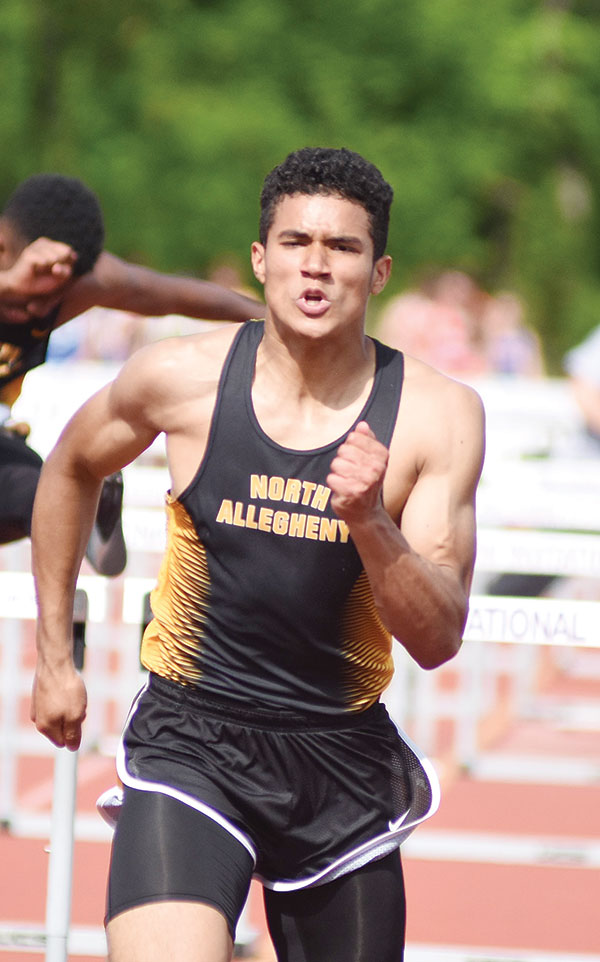 AYDEN OWENS OF NORTH ALLEGHENY, a University of Southern California recruit, won the Class 3A 110 and 300-meter hurdle events, setting a meet record in both events. Owens also won the Long Jump event.