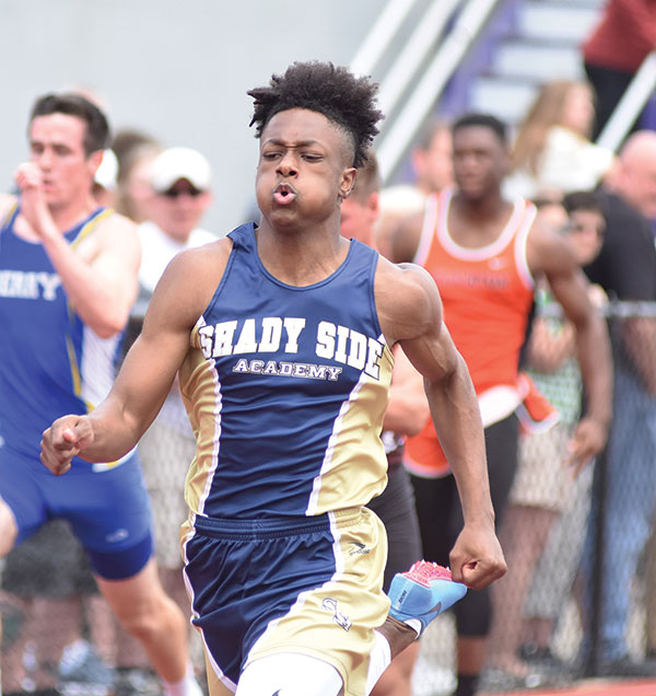 MICHAEL “DINO” TOMLIN OF SHADY SIDE ACADEMY won the 300-meter hurdles.