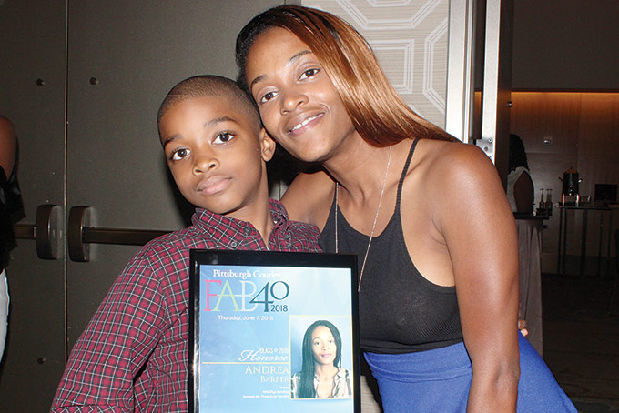 FAB 40 HONOREE ANDREA BARBER, middle, with her family, including Barber’s mother, Camille Robinson, and Barber’s sons, Corey, Cody and Camerin, far right. Also included is Barber’s sister, Anita, and Barber’s nephew, Landon, second from right. (Photos by J.L. Martello)