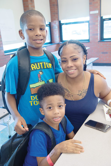 KAITEL SCOTT, right, with little ones Clinton, 12, Kashmonet, 7, and Kamiya, 10 months. They’re pictured with Pittsburgh Public Schools employees during the back-to-school event at Faison Academy, Aug. 20. (Photos by Courier photographer Gail Manker)