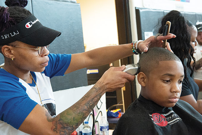 TIJUAN, 11, gets a cut from Melajia R. Henderson of Dreamz Hair Salon…