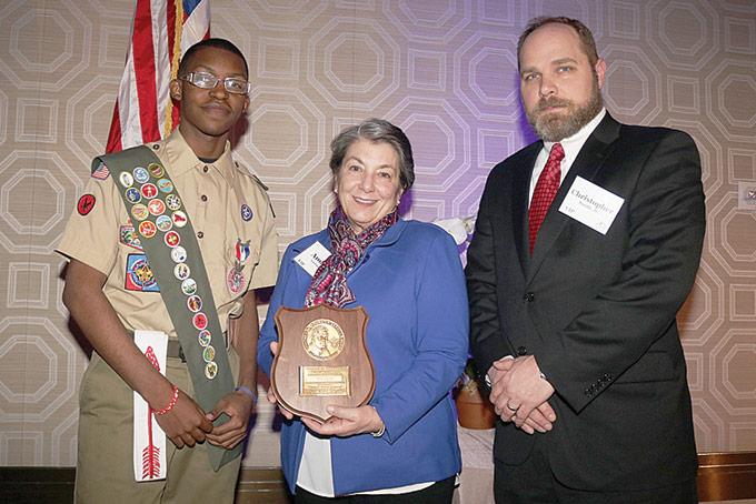 EAGLE SCOUT GEORGE BREVARD of Troop 760 presenting an award to Chris Smith and Andrea Geraghey.
