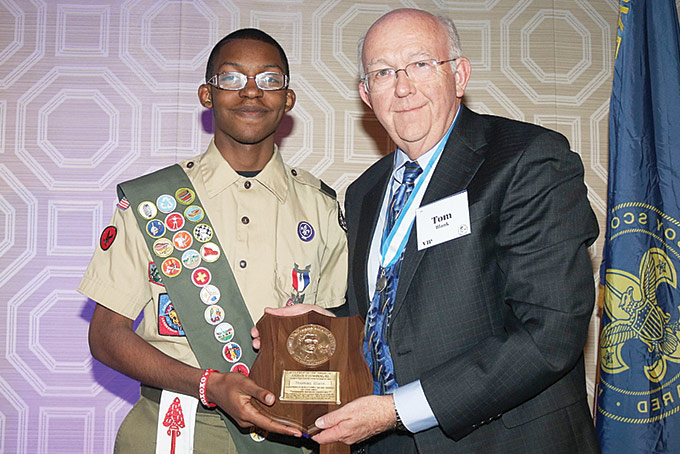 THOMAS BLANK is presented the service award by George Brevard of Troop 760.