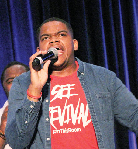 Golden, the popular 2014 “Sunday Best” winner and Cleveland native, approached the stage in an intense worship moment that had already been initiated by the church’s local singers and motivated the standing-room-only crowd into a crescendo of animated singing, twirling and chanting to his mostly contemporary lyrics.