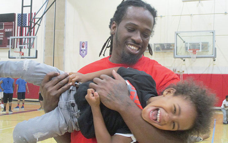 DADS PLAY—TYRESE GILBERT plays with his 3-year-old son, Benaiah, at the 10th annual March DADness basketball tournament, March 17, 2018 at Pittsburgh Obama. (Photo by Rob Taylor Jr.)