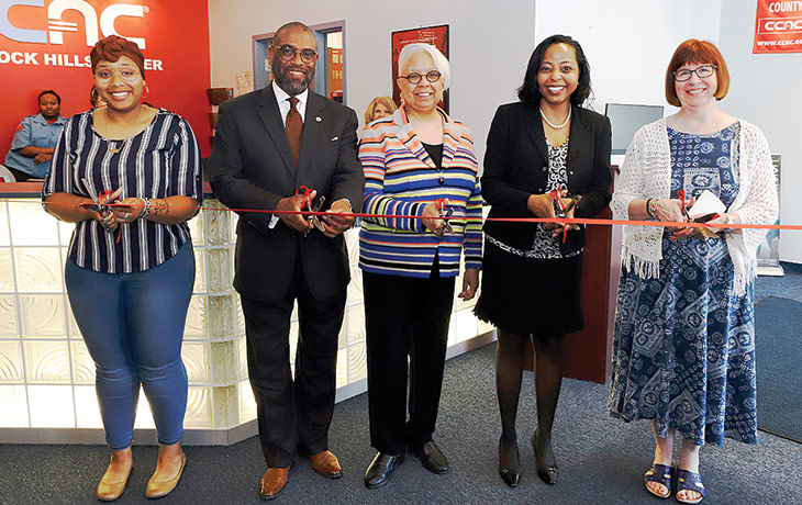 THE GRAND REOPENING—Teiara Hughes, president of the Braddock Hills Student Government Association; Dr. Quintin Bullock, president of CCAC; Charlene Newkirk, president of CCAC South Campus, Braddock Hills Center and Washington County Center; Dr. Tiffany Evans, interim assistant dean of CCAC Braddock Hills Center; and Susan Komlos, lead instructor, MOST, CCAC Braddock Hills.