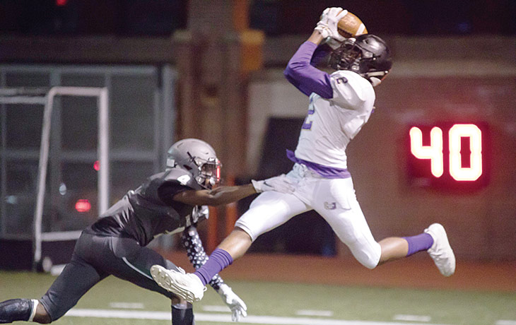BRENDAN WALLS goes airborne to catch a pass for University Prep, also known as USO, in a huge win over Allderdice, Sept. 20. (Photos by Courier photographer Andre Swinton Jr.)