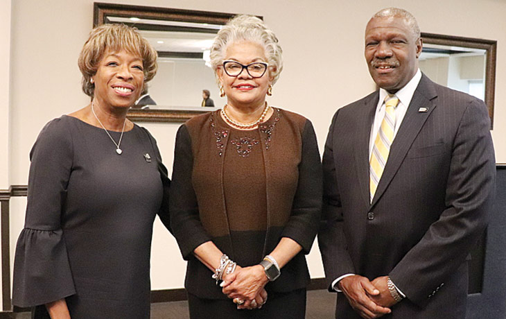 PARTNERS—Chamber President and CEO Doris Carson Williams, board Chair Samuel Stephenson and California University of Pennsylvania President—and Chamber member—Geraldine Jones pose after her presentation at the Sept. 20 Powerbreakfast meeting. (Photo by Courier photographer J.L. Martello)
