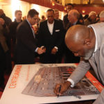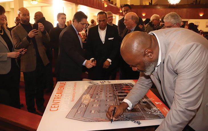 (ABOUT THE TOP PHOTO: REVEREND GLENN GRAYSON SR. signs the poster showing the rendering of the Centre Avenue YMCA, as elected officials such as R. Daniel Lavelle and Jay Costa look on. – Photo by J.L. Martello)
